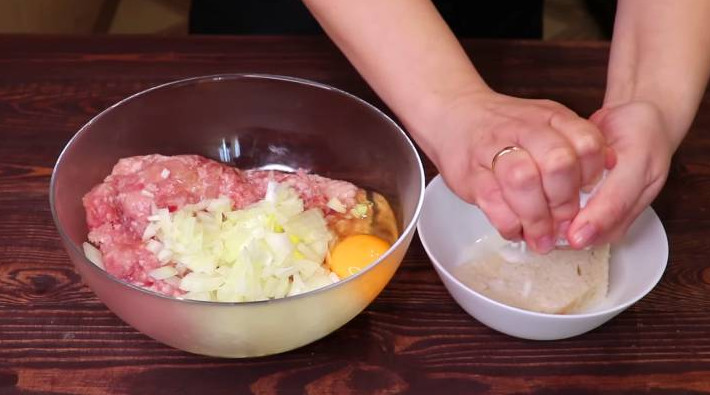 У батона удалите корочку. Залейте молоком. К фаршу добавьте мелко нарезанную луковицу и яйцо. Отожмите батон. Посолите, поперчите, перемешайте фарш до однородности.