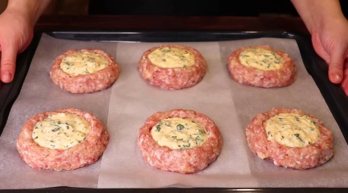 Разнообразьте меню своей семьи новым блюдом! Вкуснятина из фарша вместо обыденных жареных котлет. Можно подавать с любым гарниром: хоть пюре, хоть макароны, хоть гречка. Готовится легко и просто, а получается вкусно с 1-го раза! Обязательно записывайте удачный рецепт и повторяйте. Наталья Клевер/youtube Мясная основа Сначала приготовим основу из фарша — один в один как на обычные котлеты! Ингредиенты: Фарш — 500 г; Лук — 1 шт.; Яйцо — 1 шт.; Батон — 2 ломтика; Молоко — 100 мл; Соль, специи. У батона удалите корочку. Залейте молоком. К фаршу добавьте мелко нарезанную луковицу и яйцо. Отожмите батон. Посолите, поперчите, перемешайте фарш до однородности. Наталья Клевер/youtube Противень выстелите пергаментной бумагой или фольгой, смазанной маслом. Мокрыми руками сформируйте из фарша 6 шаров. Наталья Клевер/youtube Сливочная начинка Приступаем к следующему этапу. Именно за счёт начинки блюдо получается удивительно вкусным! Ингредиенты: Сыр твёрдый — 100 г; Чеснок — 2 зубчика; Яйцо — 1 шт.; Сметана или майонез — 100 г; Зелень по вкусу. Натрите твёрдый сыр. Добавьте яйцо, любую зелень (немного), измельчённый чеснок, сметану или майонез. Перемешайте — начинка готова! Наталья Клевер/youtube Котлеты по-новому В мясных шариках сделайте углубление пальцами (или дном стакана, смоченным водой). Выложите достаточно начинки. Отправьте в духовку, разогретую до 200 градусов. Запекайте в течение 40 минут. Наталья Клевер/youtube При таком способе приготовления котлеты получаются очень сочными! А аппетитная сливочная шапочка добавляет блюду новый вкус. Наталья Клевер/youtube Это не только аппетитно, но ещё и красиво! Оригинальная подача котлет из духовки со сливочной начинкой. Подавайте с любым гарниром, который любит ваша семья!