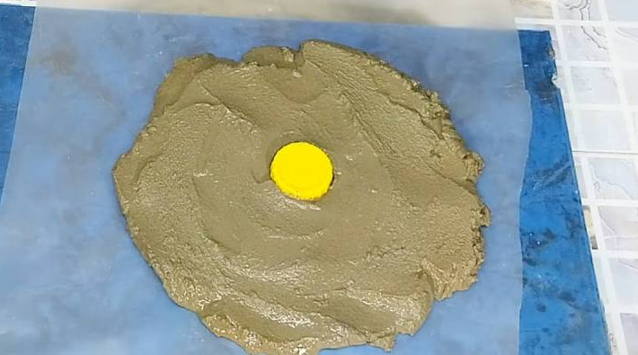 Рабочую поверхность застелите плёнкой. Цемент смешайте с песком в пропорции 1:2. Добавьте немного воды, замесите густой раствор. Сформируйте дно. В центр положите крышку от пластиковой бутылки.
