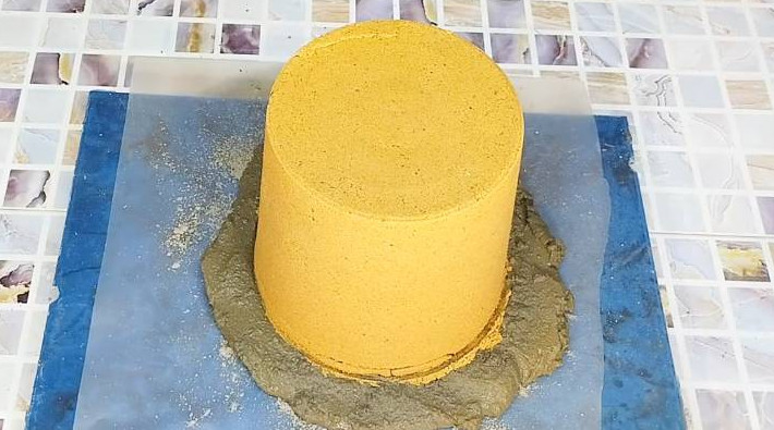 Пластиковое ведёрко наполните влажным песком. Утрамбуйте. Переверните и поставьте на дно из цемента. Уберите ведёрко.