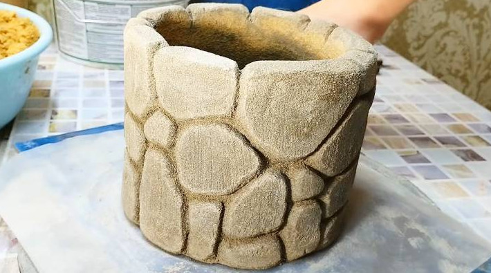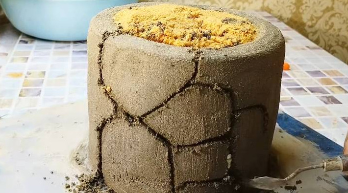 Взгляните на эту рукотворную красоту! Её сможет сделать абсолютно каждый человек. Это нетрудно, но очень интересно! Небольшой горшок для цветов из цемента с имитацией натурального камня — то, что нужно каждому садоводу! Можно увеличить объём и сделать полноценный вазон для участка. ПОДЕЛКИ ИЗ ЦЕМЕНТА/youtube Материалы и инструменты: цемент; песок; пластиковое ведёрко; мастихин; акриловая краска; клей ПВА. Техника лепки Рабочую поверхность застелите плёнкой. Цемент смешайте с песком в пропорции 1:2. Добавьте немного воды, замесите густой раствор. Сформируйте дно. В центр положите крышку от пластиковой бутылки. ПОДЕЛКИ ИЗ ЦЕМЕНТА/youtube Пластиковое ведёрко наполните влажным песком. Утрамбуйте. Переверните и поставьте на дно из цемента. Уберите ведёрко. ПОДЕЛКИ ИЗ ЦЕМЕНТА/youtube Цементно-песчаный раствор разведите водой, чтобы он стал жиже. Вылейте на песок. Разровняйте удобным инструментом. Жидкий раствор очень быстро схватывается. А потому через короткое время можно добавить полноценный слой (1 см) уже густого цементно-песчаного раствора. Сразу срежьте верхушку. Форма под горшок готова! Оставьте на 2 часа. ПОДЕЛКИ ИЗ ЦЕМЕНТА/youtube Имитация камня Мастихином или любым другим удобным инструментом вырежьте рисунок камня. Кисточкой смахните остатки смеси. ПОДЕЛКИ ИЗ ЦЕМЕНТА/youtube Оставьте на сутки. После этого можно удалить песок, крышку из дна и приступать к покраске! ПОДЕЛКИ ИЗ ЦЕМЕНТА/youtube Покройте поделку сначала коричневой акриловой краской. Через некоторое время покрасьте камни в желаемый цвет. Вместо дорогого акрилового лака воспользуйтесь обыкновенным клеем ПВА. Он создаёт отличное защитное покрытие. ПОДЕЛКИ ИЗ ЦЕМЕНТА/youtube Наполните горшочек землей и высадите цветы. Такой же вазон, но уже большего объёма, можно сделать для своего участка! Это совершенно не сложно и увлекательно.
