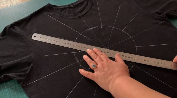 С помощью линейки и обмылка найдите середину футболки. Нарисуйте любую геометрическую фигуру. По желанию можно добавить растительные мотивы, лучи, контуры животных и т. д.