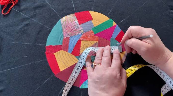 Мелкие лоскутки ткани приклейте к кругу с помощью паутинки и утюга . Подрежьте, если они выступают за пределы круга. Термо исчезающей ручкой нарисуйте спираль по кругу. Для ускорения работы воспользуйтесь сантиметром.