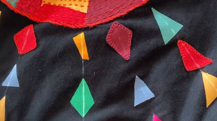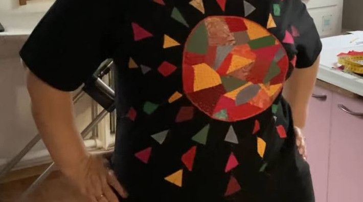Получилась яркая футболка в технике каванди! Таким же образом можно нарисовать любую геометрическую фигуру и заполнить её лоскутками. А дальше — дело техники! Выбирайте красивый ручной шов и оформляйте им декор.