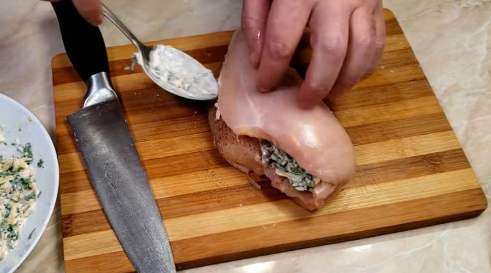 Выложите на половинку раскрытого филе 1 ст. л. начинки. Закройте грудку обратно.