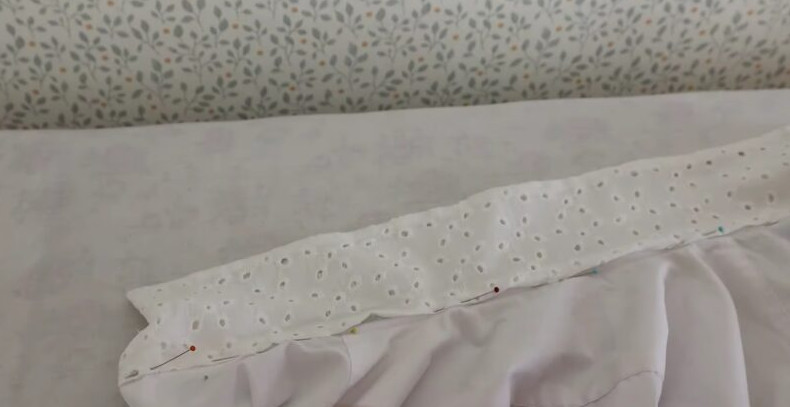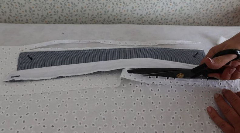 Так как планка была двойной, одна часть останется прежней. Ко второй части планки пристрочите полосу белой ткани шириной 5 см.