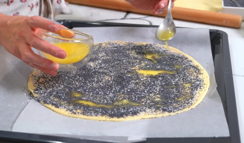 Раскатайте первый шарик в пласт диаметром 30-35 см. Переложите тесто на противень, застеленный пергаментной бумагой. Сверху на тесто выложите 1/3 часть сахара и мака, полейте начинку растопленным сливочным маслом. Повторите действия еще с двумя частями теста.