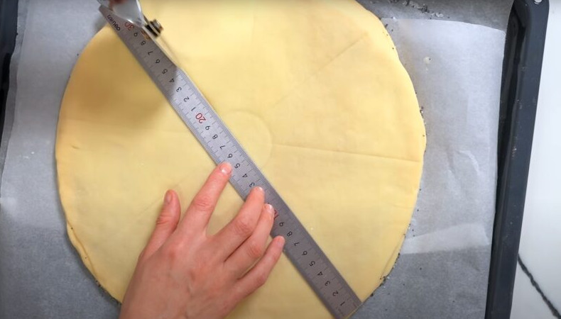 Отметьте центр пирога с помощью стакана, затем разделите пирог на 8 равных сегментов. Для удобства можно использовать линейку. Разрежьте пирог по намеченным линиям.