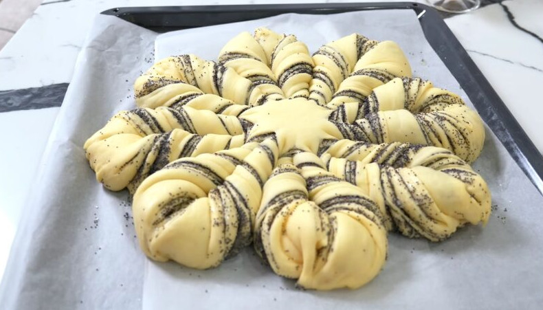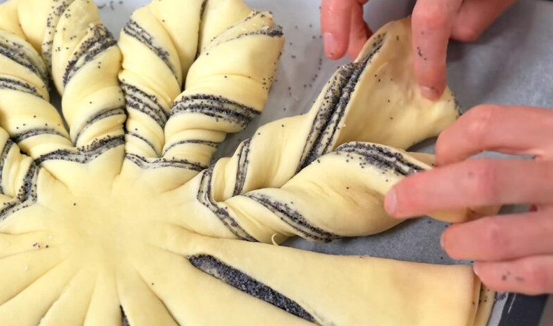 Красивый маковый пирог с большим количеством начинки — это выпечка и на каждый день, и на праздник. Готовится пирог очень просто, из доступных ингредиентов, а благодаря необычному способу формовки получается таким красивым, что его можно смело ставить на стол к приходу гостей. Пирог по этому рецепту можно приготовить к Пасхе или взять с собой на природу во время майских праздников. Alina FooDee/youtube Необходимые ингредиенты: тесто: сухие быстродействующие дрожжи — 7 г; теплое молоко — 200 мл; сахар — 80 г; ванильный сахар — 10 г; яйца — 2 шт; мука — 500-550 г; соль — 0,5 ч.л; сливочное масло — 50 г. начинка: сахар — 120 г; мак — 100 г; сливочное масло — 70 г. для смазывания выпечки: желток — 1 шт; молоко — 1 ч.л. для глянцевого блеска: сахар — 1 ст.л; кипяток — 2 ст.л. Процесс приготовления Соедините дрожжи с теплым молоком, столовой ложкой сахара и 3 столовыми ложками муки (из общего объема) и оставьте в теплом месте на 10-15 минут. За это время дрожжи начнут активно пениться. Добавьте в емкость оставшийся сахар, яйца комнатной температуры, ванильный сахар, соль, размягченное сливочное масло и хорошо перемешайте все ингредиенты. Частями введите просеянную муку и замесите однородное упругое тесто. Переложите тесто в миску, накройте пленкой и оставьте на 1,5-2 часа. За это время тесто сильно увеличится в размере. Alina FooDee/youtube Готовое тесто обомните несколько минут и разделите на 4 равных части. Из каждой части сформуйте шарик. Перед дальнейшей работой тесто должно «отдохнуть» 15-20 минут. Раскатайте первый шарик в пласт диаметром 30-35 см. Переложите тесто на противень, застеленный пергаментной бумагой. Сверху на тесто выложите 1/3 часть сахара и мака, полейте начинку растопленным сливочным маслом. Повторите действия еще с двумя частями теста. Alina FooDee/youtube Отметьте центр пирога с помощью стакана, затем разделите пирог на 8 равных сегментов. Для удобства можно использовать линейку. Разрежьте пирог по намеченным линиям. Alina FooDee/youtube Каждый сегмент разделите еще пополам. Alina FooDee/youtube Для формовки красивых лепестков закрутите сегменты по 4 раза и соедините попарно. Оставьте пирог в теплом месте на 30 минут. Alina FooDee/youtube Перед выпечкой смажьте пирог смесью желтка и яйца. Выпекайте пирог в предварительно разогретом до 180 градусов духовом шкафу 20-25 минут. Alina FooDee/youtube Придать пирогу глянцевый блеск поможет сахарный сироп, приготовленный из 1 столовой ложки сахара и 2 столовых ложек кипятка. Смажьте сиропом еще горячий пирог. Выглядит пирог просто потрясающе! А нежное тесто, большое количество начинки и аромат точно не оставят никого равнодушным! Alina FooDee/youtube
