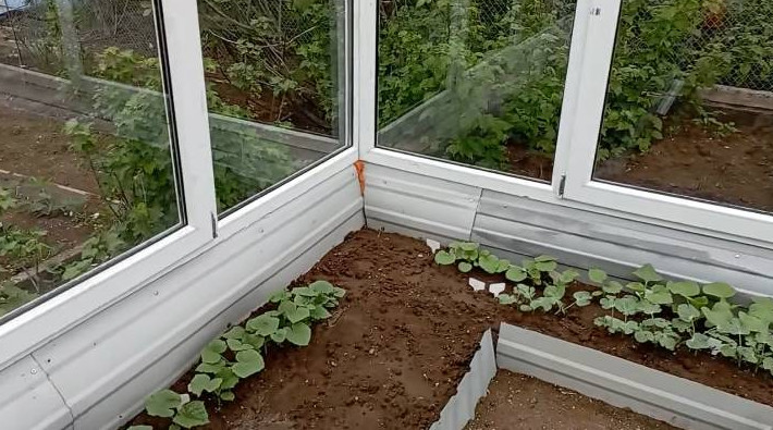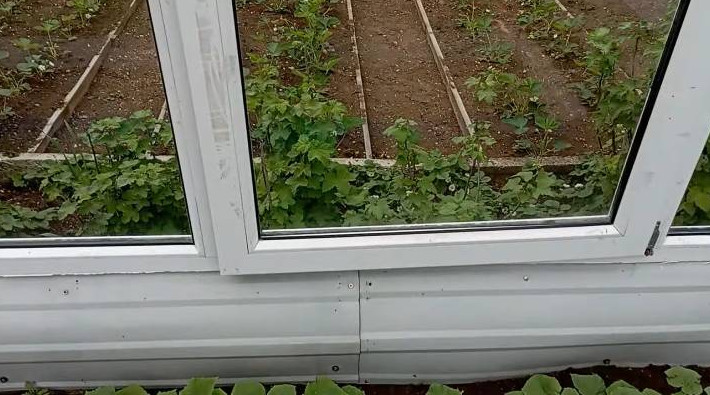 Основание теплицы закрыли профилем. Оконные рамы между собой также закрепили на саморезы.