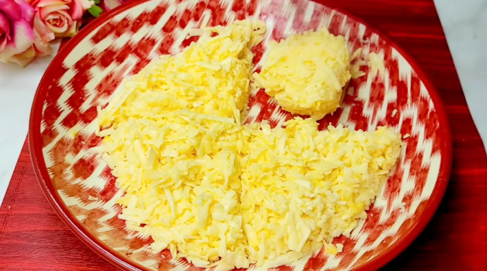 Натрите любой твёрдый сыр на крупной тёрке. Добавьте 1 яйцо. Если сыр не достаточно солёный, то присолите его. Также в начинку, по желанию, можно добавить жирный творог. Перемешайте сырое яйцо и сыр. Разделите на 4 части. Каждую соберите в шар.