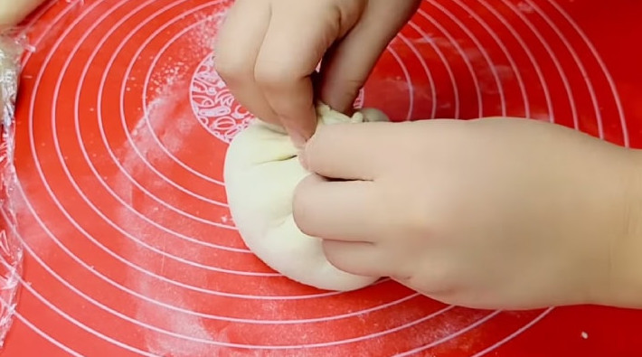 Тесто разделите на 4 части. Раскатайте, положите по центру шарик из начинки. Соберите тесто сверху, подобно хинкали. Затем переверните швом вниз.
