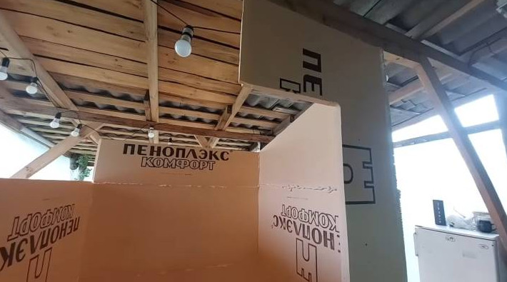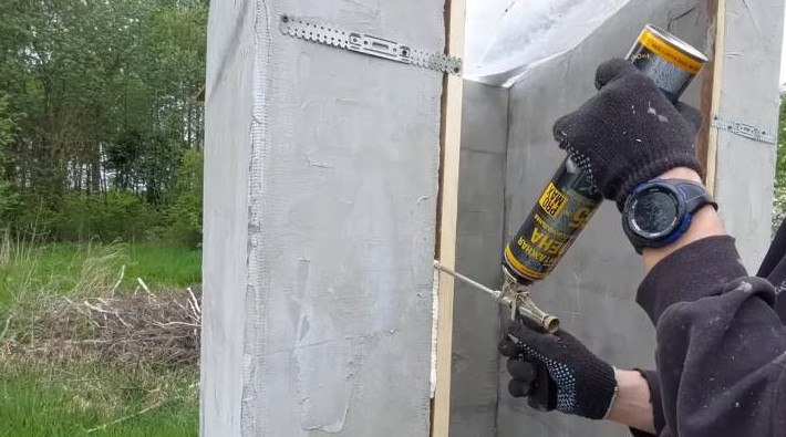 Из листов пеноплекса соберите будущий каркас туалета: стенки и крышу. Скрепляйте монтажной пеной и фиксируйте саморезами для большей надежности.