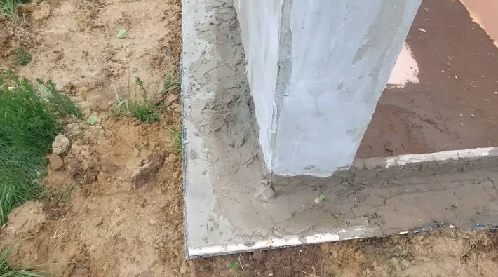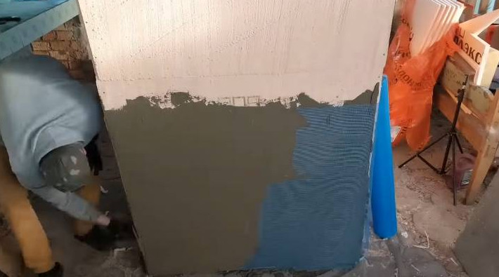 Разведите штукатурно-клеевую смесь водой по инструкции. Жёсткой щёткой поцарапайте каркас для лучшего сцепления с материалами. Приклейте на каркас стеклосетку для армирования. Нанесите и разровняйте смесь.