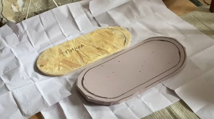 Перенесите выкройку на лист ОСБ. Можно также взять тонкую фанеру. Выпилите спинку и сиденье. Чуть большего размера вырежьте поролоновые детали. Приклейте на аэрозольный клей, подворачивая края, чтобы они были мягкими и гладкими.