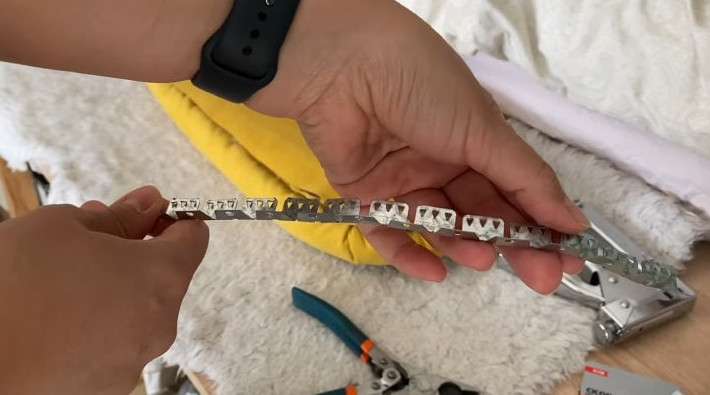 Обтяните заготовки синтепоном. Подберите хорошую ткань (в МК — велюр). Вырежьте с запасом обтяните и зафиксируйте мебельным степлером.