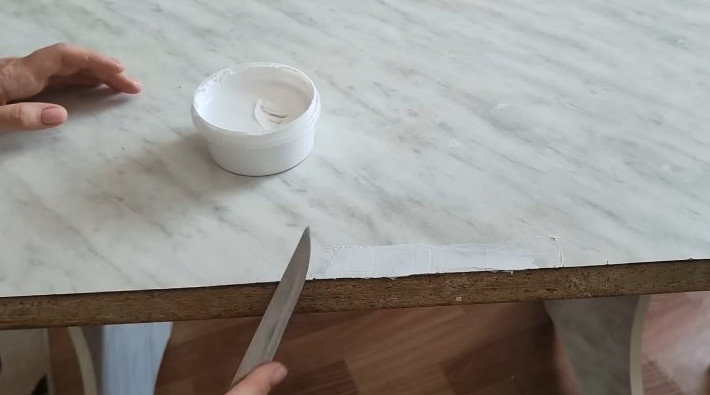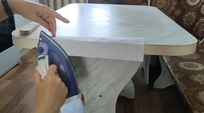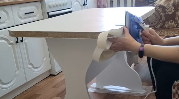 Для начала со старого стола нужно снять кромку, если она пришла в негодность. Для того чтобы это было легче сделать, проутюжьте её через бумагу. Клей размягчится, и удалить её будет легко! Подденьте кромку ножом и снимите.