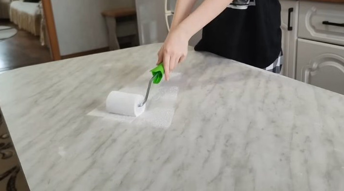 Хорошенько обезжирьте стол со всех сторон перед покраской. Подберите краску желаемого оттенка и с помощью валика + кисти нанесите на поверхность.