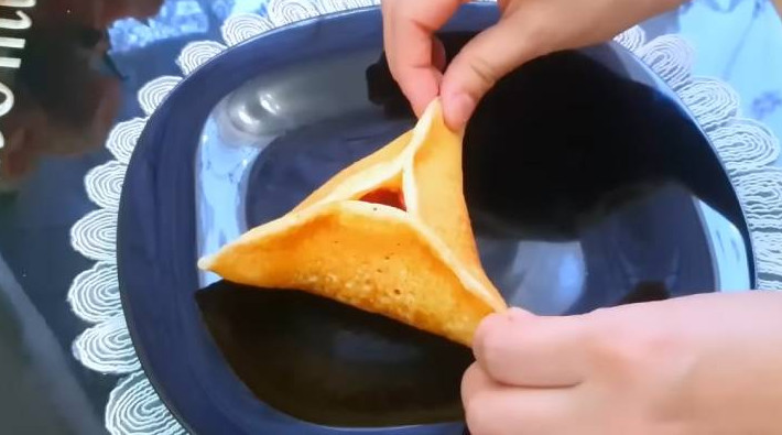 Положите начинку (сыр, творог, фарш, варенье — по выбору). Защипните края в треугольник. Блинчики готовы!