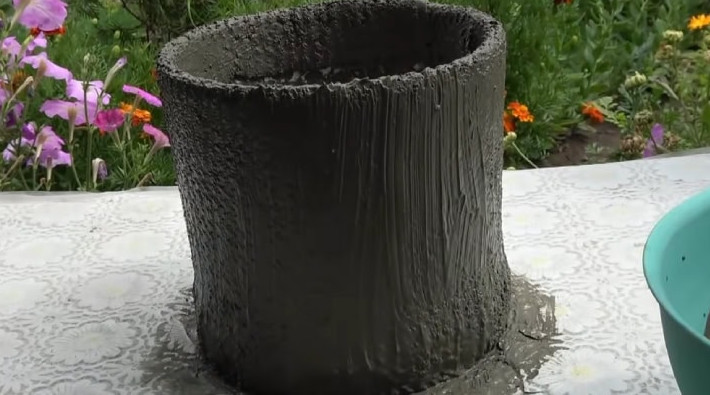 На дне ведёрка сделайте дренажные отверстия. Обрежьте ободок, уберите крышку и этикетку. Разведите цемент водой до жидкого состояния, замочите тряпку. Оберните ею ведёрко со всех сторон. Сверху смажьте более густым раствором цемента. Оставьте на сутки.