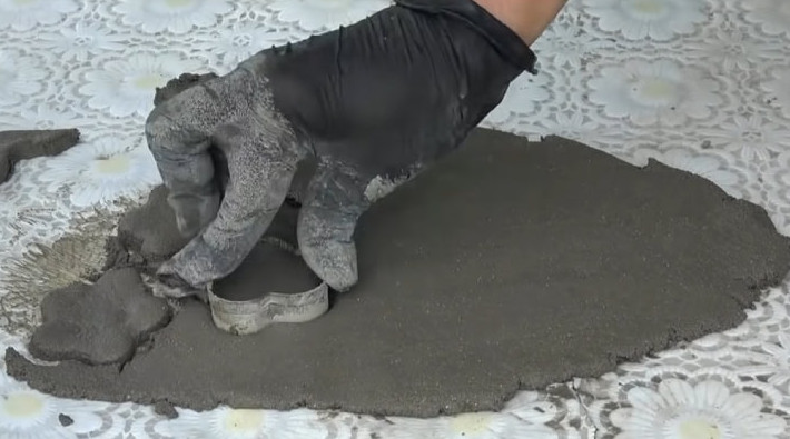 Соедините песок с цементом в соотношении 1:1 (по 200 г). Разведите водой до густой консистенции (100 мл). Добавьте 1 ст. л. клея ПВА. Переложите на рабочую поверхность, раскатайте, как тесто. С помощью формы для печенья вырежьте декор. Это могут быть сердечки, звёзды, цветы и т. д.