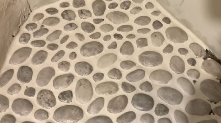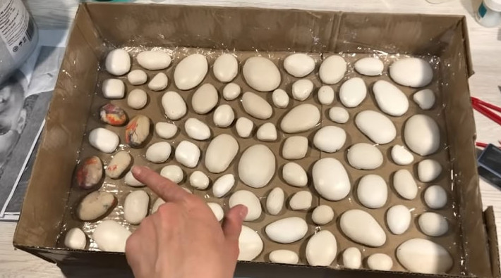 Попробуйте создать свою форму для гальки и выложить её на пол! Это не быстро, но очень интересно и практично.