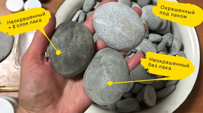 Разведите плиточный клей согласно инструкции на упаковке. Выложите самодельные окрашенные камушки, с некоторой силой нажимая на них и утапливая в клее. Покройте «гальку» лаком ещё 2-3 раза.