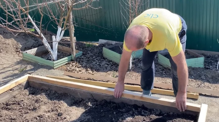Разложите подготовленные доски на грядке. Закрепите их между собой, но не к самой грядке!
