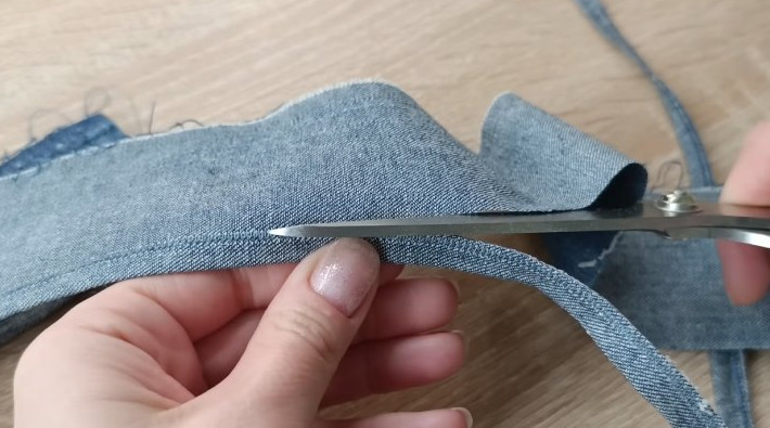 Разрежьте джинсы так, чтобы раскрыть штанину. Вырежьте боковые швы. Сверните край полотна буквально на 0,5 см лицевой стороной внутрь. Проложите строчку на машинке (плотный зигзаг). Срежьте по краю уже обработанную полосу!