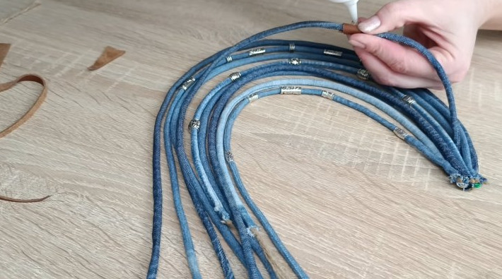 Через другой, не зашитый край проденьте бусины и кусочки искусственной кожи. Приклейте, чтобы зафиксировать на одном месте.