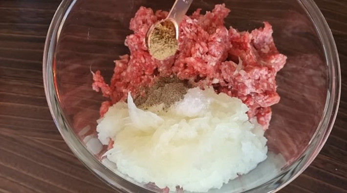 Измельчите лук, добавьте к фаршу. Посолите, приправьте, перемешайте. Начинка готова!