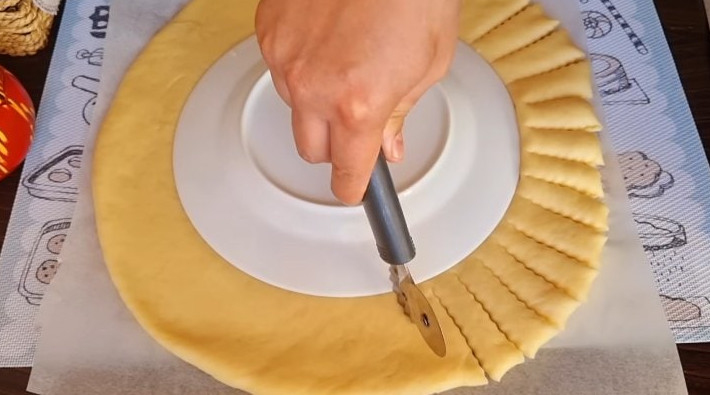 Тесто положите на стол, раскатайте. Положите по середине круглую тарелку, разрежьте край ножом (обычным или фигурным) на кусочки.