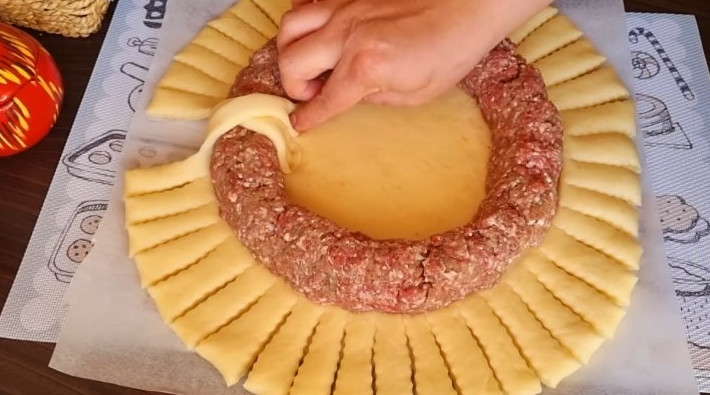 От кусочка этого пышного, мягкого, аппетитного пирога невозможно отказаться! Уверены, семья оценит по достоинству столь вкусную и сытную выпечку. От пирога вскоре не останется ни кусочка! Готовится удивительно просто и быстро. Вкусно так, что пальчики оближешь! Забирайте себе рецепт в копилочку и пеките вкуснятину для семьи. Секреты Узбекской кухни/youtube Мягкое пышное тесто Оно готовится очень просто и быстро! Получается всегда вкусно. Ингредиенты: мука — 500 г; сахар — 1 ст. л.; соль — 1 ч. л.; дрожжи — 0,5 ч. л.; тёплая вода — 100 мл; тёплое молоко — 100 мл; растительное масло — 100 мл; яйцо — 1 шт. В муку добавьте соль, сахар, дрожжи, перемешайте. Влейте масло, воду, молоко, разбейте 1 яйцо. Замесите мягкое тесто. Прикройте плёнкой или полотенцем, оставьте на 1,5—2 часа. Секреты Узбекской кухни/youtube Мясная начинка Она нравится каждому, кто её пробует! Экспериментируйте и добавляйте свои специи. Ингредиенты: говяжий фарш — 400 г;р лук — 1 шт.; соль — 1,5 ч. л.; перец — 1/4 ч. л.; кумин — 1 ч. л.; для украшения: аджика/кетчуп сыр. Измельчите лук, добавьте к фаршу. Посолите, приправьте, перемешайте. Начинка готова! Секреты Узбекской кухни/youtube Сборка и выпекание пирога Тесто положите на стол, раскатайте. Положите по середине круглую тарелку, разрежьте край ножом (обычным или фигурным) на кусочки. Секреты Узбекской кухни/youtube Уберите тарелку. Выложите начинку по кругу. Крест-накрест перекиньте полоски теста. Секреты Узбекской кухни/youtube Переложите на противень, выстеленный пергаментной бумагой. Смажьте желтком. Выпекайте при 180 градусах в течение 35 минут. Секреты Узбекской кухни/youtube Достаньте пирог. Серединку смажьте аджикой или кетчупом. Сверху посыпьте сыром. Отправьте в духовку ещё на 10 минут. Секреты Узбекской кухни/youtube Вкуснейший пирог без особых премудростей! Красивый, сытный и аппетитный. Секреты Узбекской кухни/youtube Удивите родных и близких столь необычной выпечкой! Это и вкусно, и оригинально. Приятного аппетита!