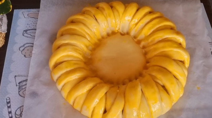 Переложите на противень, выстеленный пергаментной бумагой. Смажьте желтком. Выпекайте при 180 градусах в течение 35 минут.