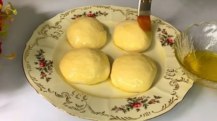 В кипяток добавьте соль, размешайте. Всыпьте манку и муку. Руками замесите мягкое тесто. Прикройте полотенцем, оставьте на 10 минут. Разделите на 4 части. Каждую скатайте в шар. Смажьте растительным маслом (или пополам масло + маргарин). Оставьте ещё на 10 минут.