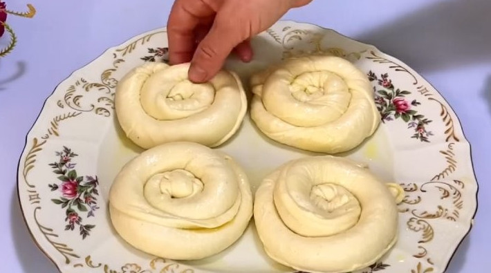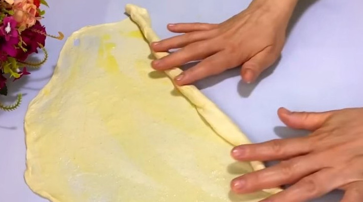 А его, в свою очередь, сверните улиткой. Повторите то же самое с остальными кусочками теста.