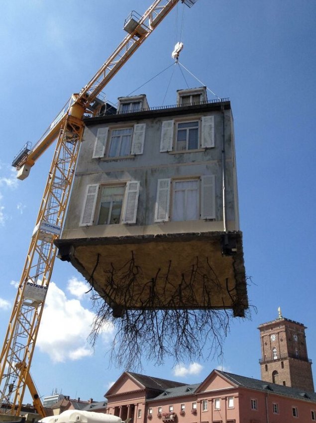 Оказывается, это художественная инсталляция, скульптура немецкого художника в немецком городе Карлсруэ. Модель дома с приклеенными «корнями».