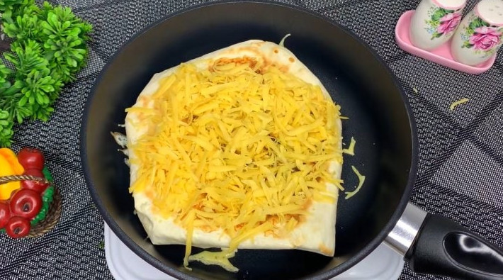 Переверните лаваш на другую сторону, присыпьте сыром. Накройте крышкой и готовьте ещё около 7 минут.