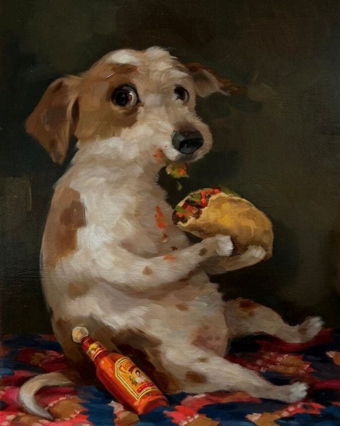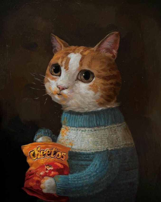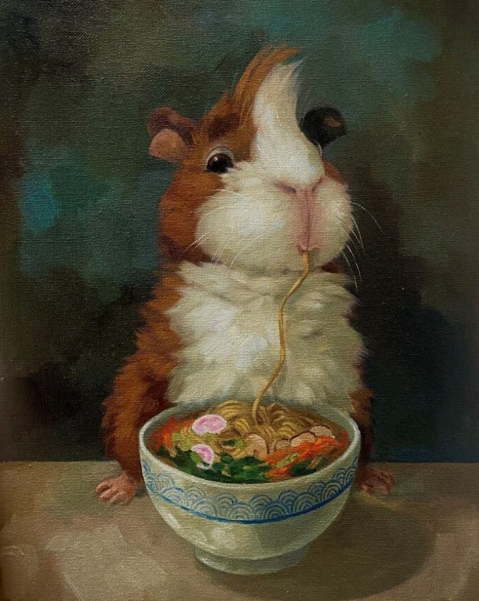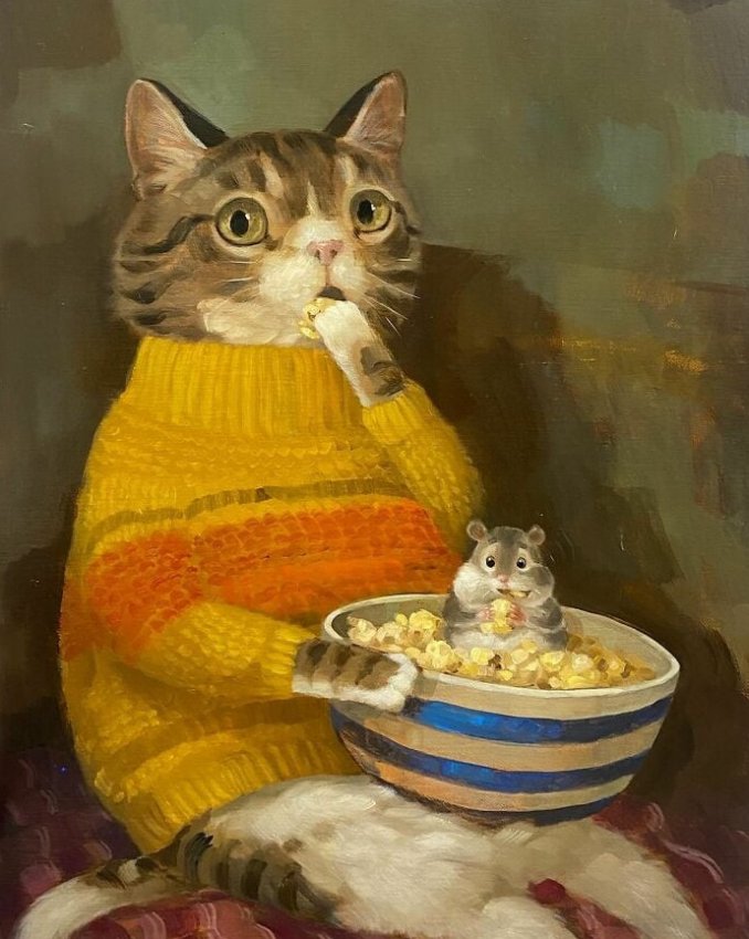 Будь то кошка, наслаждающаяся тарелкой рамэна, или собака, расслабляющаяся в спа-салоне, ее работы приносят радость зрителям и подчеркивают глубокое влияние животных на человеческие эмоции.