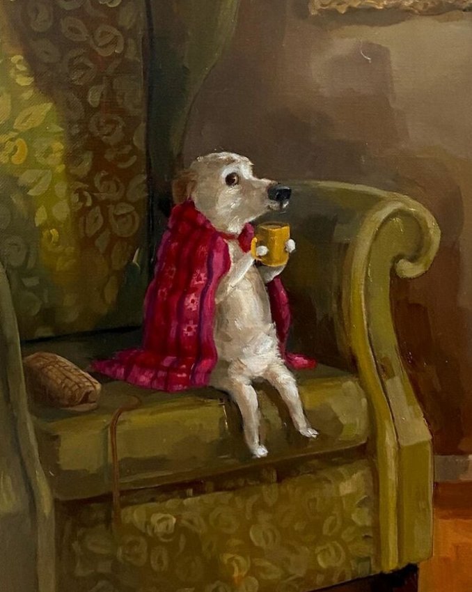 Картины маслом британской художницы Элисон Френд сочетают в себе традиционные портретные техники с современными причудами, в частности, запечатлевая человекоподобные выходки кошек и собак. Выпускница факультета изобразительного искусства Университета Ноттингем Трент, где она специализировалась на гравюре, Френд сначала сделала карьеру, иллюстрируя детские книги.