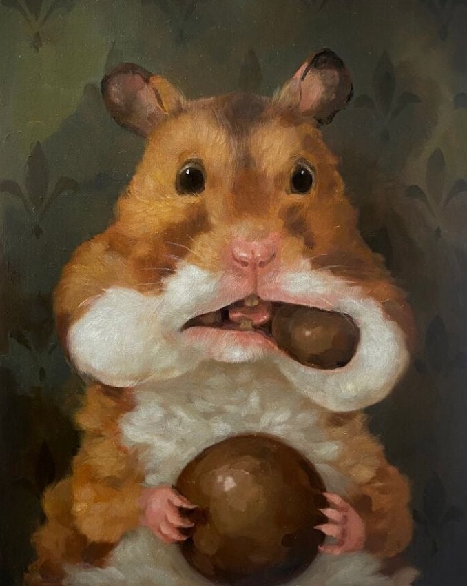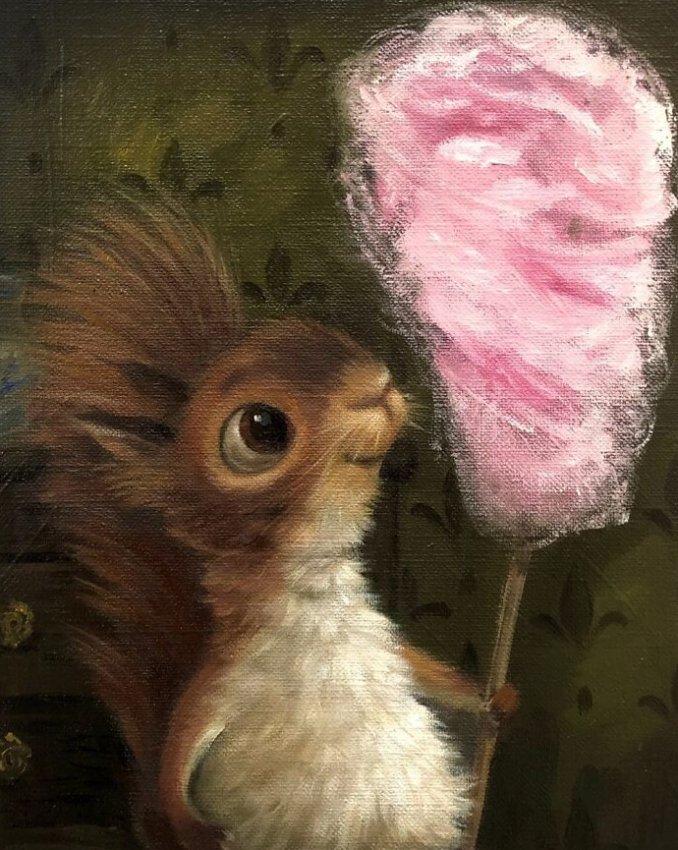 Художница делает несколько портретов, на которых изображены животные, позирующие с другими предметами, но большинство из них включают в себя сладкие угощения. Мороженое, леденцы и печенье добавляют немного ностальгии, вызывая приятные воспоминания детства. Работая маслом на льняном холсте или панно, она дала нам восхитительный взгляд на тайную жизнь животных.