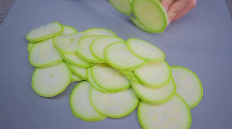 Нарежьте кабачки тонкими кружочками: чем тоньше будет нарезка, тем вкуснее получится закуска.