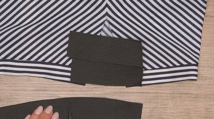 На юбке обрежьте лишнюю ткань. Приколите клин (эластичную вставку). Прострочите с обеих сторон.