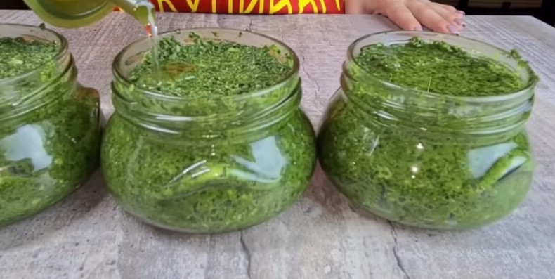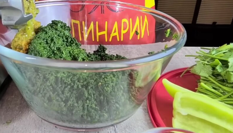 Литья хрена — кладезь полезных веществ и витаминов, поэтому не упустите возможность сделать полезную и очень вкусную заготовку с пикантным вкусом. Приправа из листьев хрена станет прекрасным дополнением как мясных, так и рыбных блюд, ее можно использовать для заправки салатов и супов, а также для приготовления пикантных бутербродов. Вкуснейшн с Lana ilanavi/youtube Необходимые ингредиенты: листья хрена — 50 шт; грецкий орех — 100 гр; чеснок — 50 гр; острый перец — 1-2 стручка; болгарский перец — 300 гр; петрушка — 50 гр; кинза — 50 гр; цедра и сок 1 лимона; растительное масло — 100 гр; соль, хмели-сунели — по вкусу. Способ приготовления Тщательно промойте и просушите листья хрена, отделите мягкую часть листа от стебля. Для приготовления приправы стебли не потребуются, но их можно использовать при заготовке огурцов и помидоров. Вкуснейшн с Lana ilanavi/youtube Приправа готовится очень просто. Все, что нужно сделать — пропустить все ингредиенты через мясорубку, или измельчить при помощи блендера. Вкуснейшн с Lana ilanavi/youtube К измельченным ингредиентам добавьте соль и хмели-сунели, а также цедру и сок одного лимона и растительное масло. Тщательно перемешайте приправу и разложите ее по чистым стеклянным баночкам небольшого объема. Каждую баночку залейте сверху растительным маслом, плотно закройте крышки. Пикантная приправа может храниться в холодильнике до 6 месяцев. Вкуснейшн с Lana ilanavi/youtube