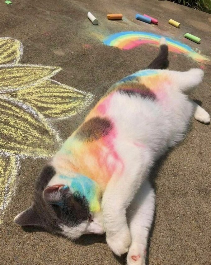 «Мои дети нарисовали разные рисунки мелками на тротуаре, а наш котик повалялся на этих рисунках»