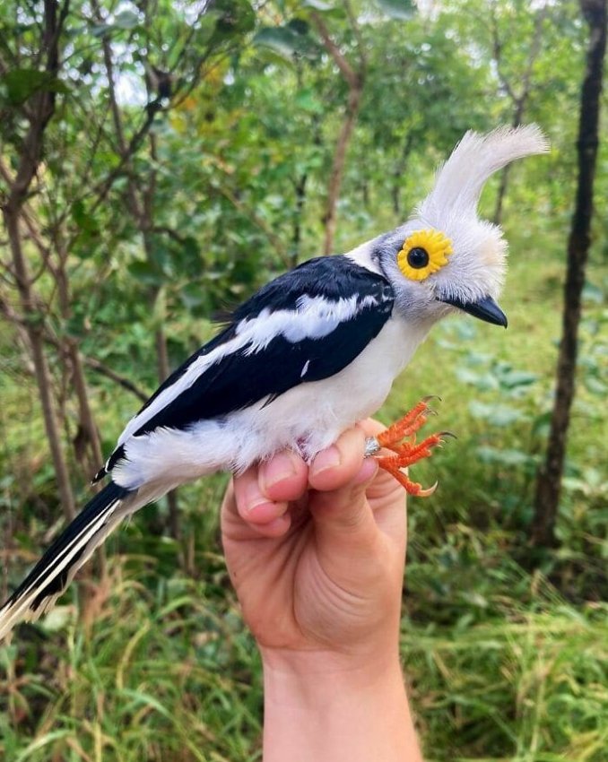 Глаза белого длиннохохлого очкового сорокопута напоминают подсолнух