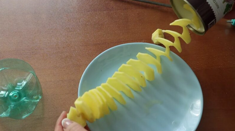 При вращении ручки прута картофель начнет нарезаться по спирали через заточенное отверстие.