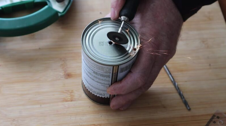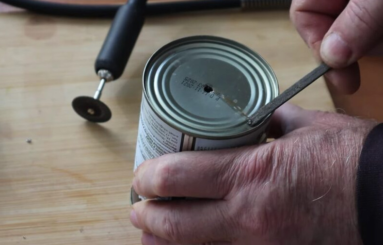 В центре дна консервной банки просверлите отверстие. Диаметр отверстия должен быть таким, чтобы туда поместился металлический прут. Второе отверстие сделайте у края окружности дна. Проведите между отверстиями линию так, чтобы она прошла по их краю. Разрежьте эту линию маленьким диском.
