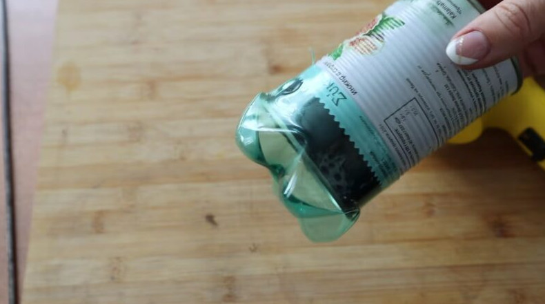 Срежьте дно пластиковой бутылки на высоту 4-5 см. Наденьте подготовленную пластиковую бутылку на открытую часть банки. Используя строительный фен, прогрейте пластиковую бутылку так, чтобы ее стенки плотно прижали банку.