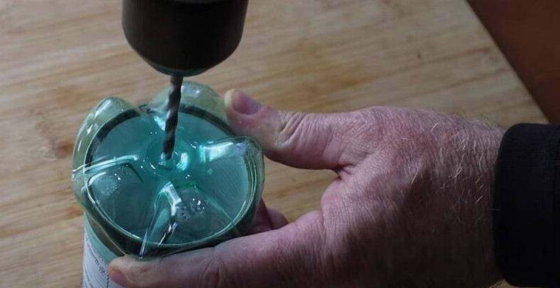 На дне пластиковой бутылки просверлите отверстие.
